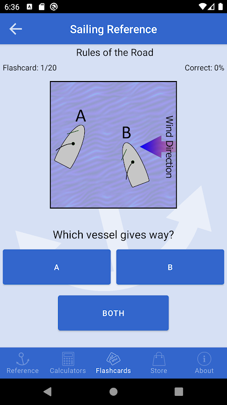 Voor degenen die behoefte hebben aan opfrissen van hun kennis van de COLREGS / IRPCS, laden de flashcards voor een snelle quiz. Inbegrepen bij de app zijn een reeks van "Rules of the Road" flashcards die talrijke botsing scenario's. Extra flashcards betrekking schip lichten, de dag vormen, vlaggen en geluidssignalen zijn beschikbaar voor aankoop in-app als een add-on Pack.