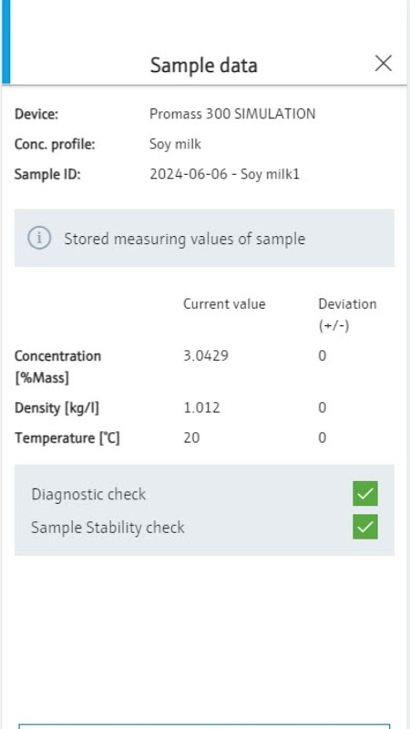 De App registreert automatisch de relevante gegevens van Promass tijdens de monstername via WiFi-verbinding. Er wordt informatie verstrekt over processtabiliteit en apparaatdiagnostiek om de monsterkwaliteit te evalueren. Op basis van het resultaat van de laboratoriumanalyse past Sample and Adjust de Promass-concentratiefunctie aan en werkt deze dienovereenkomstig bij.
