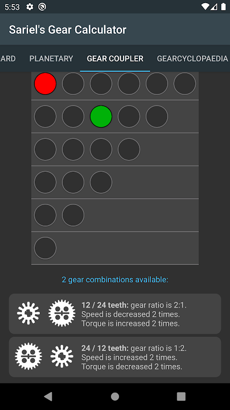 Deze tool is bedoeld voor alle AFOL's. Gebruik het om de uiteindelijke verhouding van maximaal 10 paar tandwielen te berekenen en selecteer vervolgens het gewenste type en aantal motoren om de theoretische output (snelheid en koppel) te zien. Bevat 15 maten tandwielen en 26 verschillende soorten motoren! Ook inbegrepen: een planetaire ratio-calculator, versnellingskoppeling voor het vinden van beschikbare versnellingscombinaties bij een bepaalde asafstand en Gearcyclopaedia met gedetailleerde informatie over 38 soorten versnellingen. NIEUW: het tabblad Combinatieszoeker waar u een gewenste overbrengingsverhouding en het aantal paren versnellingen dat u wilt gebruiken kunt invoeren, en de app berekent de oplossing (exact of zo dicht mogelijk).