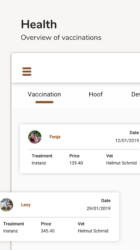 Record health aspects around the horse such as vaccinations, deworming, tooth control and the next appointment with the blacksmith.