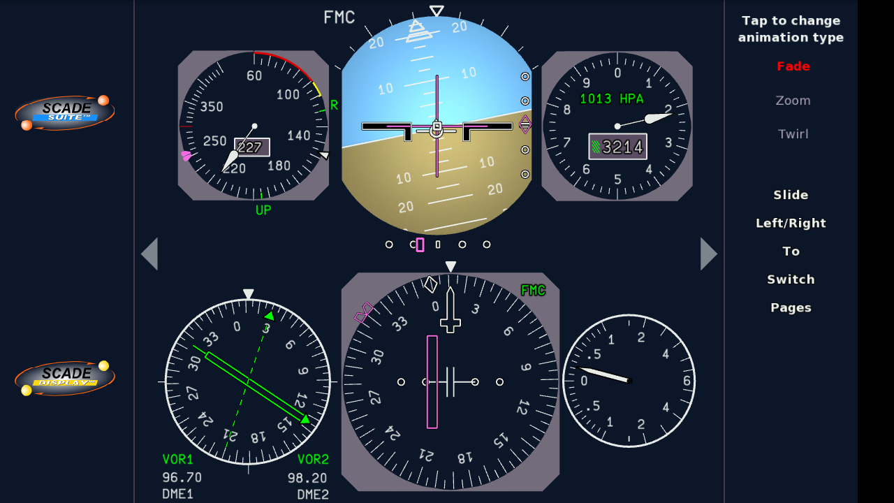 - a Primary Flight Display (PFD) page, including an Attitude Direction Indicator (ADI), Speed Counter, Altitude Counter, Flight Management Compass (FMC), Navigation Display (ND) and Vertical Speed Indicator (VSI),