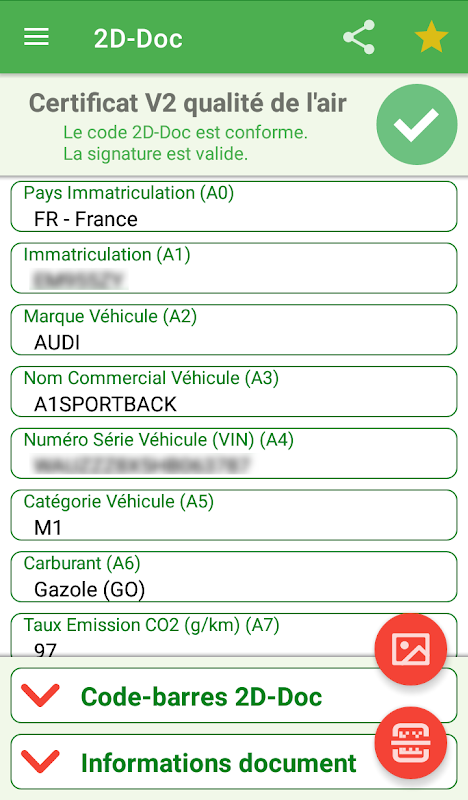 Momenteel kan deze applicatie alle documenten lezen die voldoen aan de ANTS-specificatie V3.2.6 (https://ants.gouv.fr/nos-missions/les-solutions-numeriques/2d-doc) behalve de zeer zeldzame codes -bars in versie 4 binair.
