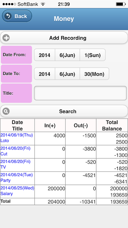 By registering the deposit, withdrawal and the date and items, you can check the balance of payments and the total.