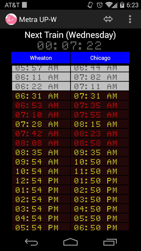 De volledige Metra UP-W schema en aftellen klok voor de volgende trein.