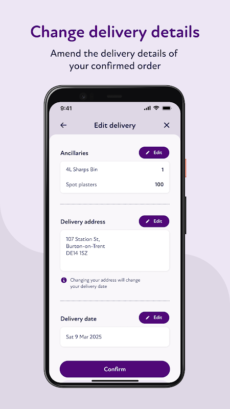 Beheer uw medicatieleveringen: Pas eenvoudig uw leveringsvoorkeuren aan, voeg items toe zoals scherpe bakken of doekjes en beheer het allemaal vanaf uw telefoon.