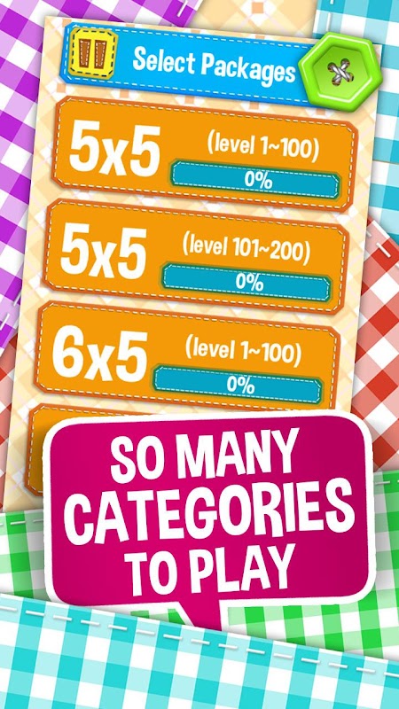 - 5x5, 6x5, 6x6, 7x7, 8x8, 9x9 levels