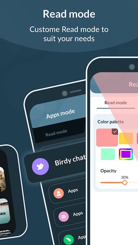 2). Leesmodus: stel de leesmodus in met behulp van kleuropties en u kunt er ook de apps-modus in instellen. Hetzelfde als schermrotatie, kunt u de leesmodus voor elke app afzonderlijk instellen.