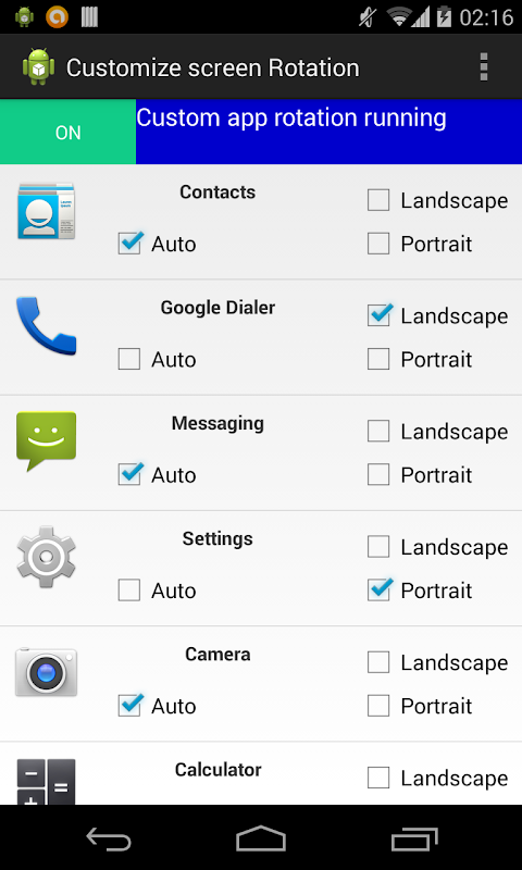 if you want auto-rotate for some app,and for some app portrait and landscape screen orientation then use this app just click on check box and turn on the app you are done.