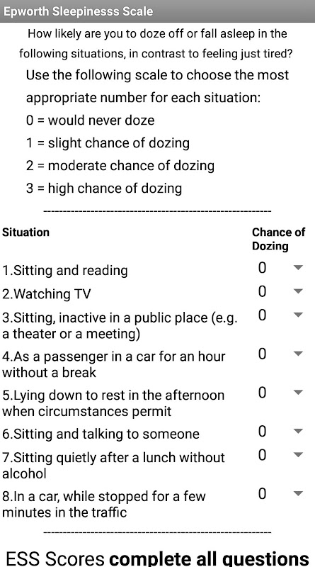 Polysomnografie (PSG) wordt gebruikt voor de diagnose van obstructieve slaapapneu (OSA). Het is meestal duur en tijdrovend. Voor de eerste screening van OSA zijn verschillende vragenlijsten ontwikkeld. We verzamelen 4 veel voorkomende vragenlijsten voor persoonlijke evaluatie van OSA: Epworth-slaperigheidsschalen, Berlijn-vragenlijst, STOP-Bang-vragenlijst en STOP-vragenlijst. U kunt ook op een andere dag opnemen om hun wijzigingen te noteren.