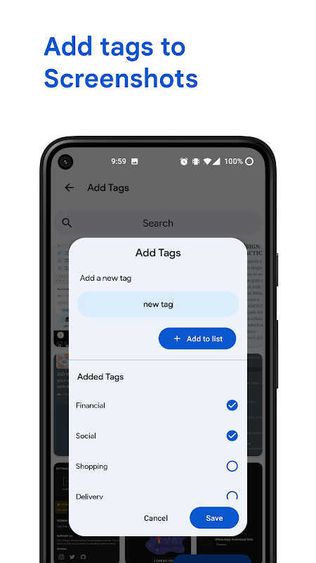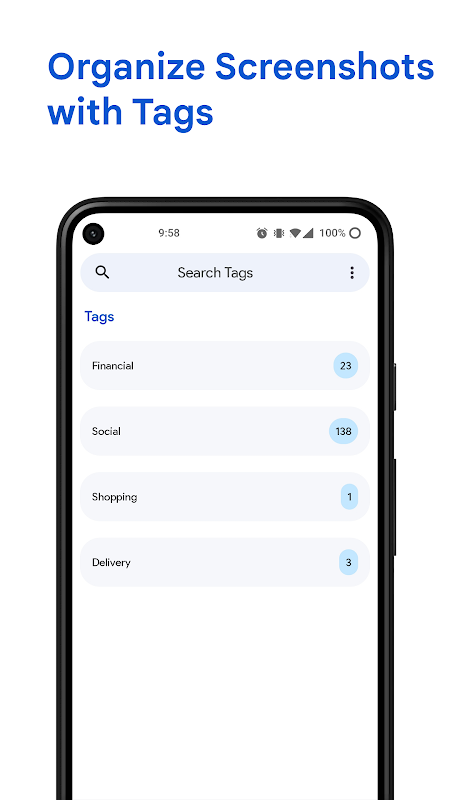 U kunt eenvoudig toegang krijgen tot schermafbeeldingen met hun tags. door naar de pagina met tags te gaan. Sociale en financiële tags worden automatisch toegevoegd op basis van de tekst in uw screenshots. U kunt ook nieuwe tags toevoegen en deze ook beheren.