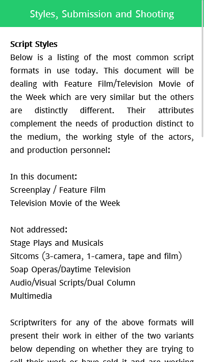 Als u op zoek bent naar een zelfstudie over het schrijven van scenario's of als u Scrip-schrijven wilt leren, dan bent u hier aan het juiste adres. Deze app helpt je te weten hoe je een script schrijft of hoe je een filmscenario maakt. Deze app geeft je het volledige script schrijven in details met een voorbeeld.