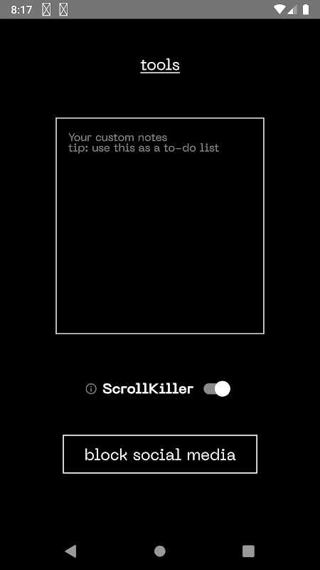 Aangepaste notities zijn niet alleen bedoeld voor een takenlijst. Het is een lanceerplatform. Schrijf een doel, een idee of een betekenisvol alternatief voor scrollen op. Gebruik ScrollKiller om je geest te trainen in het zoeken naar echte vervulling, en niet naar zinloze kunstmatige genoegens.