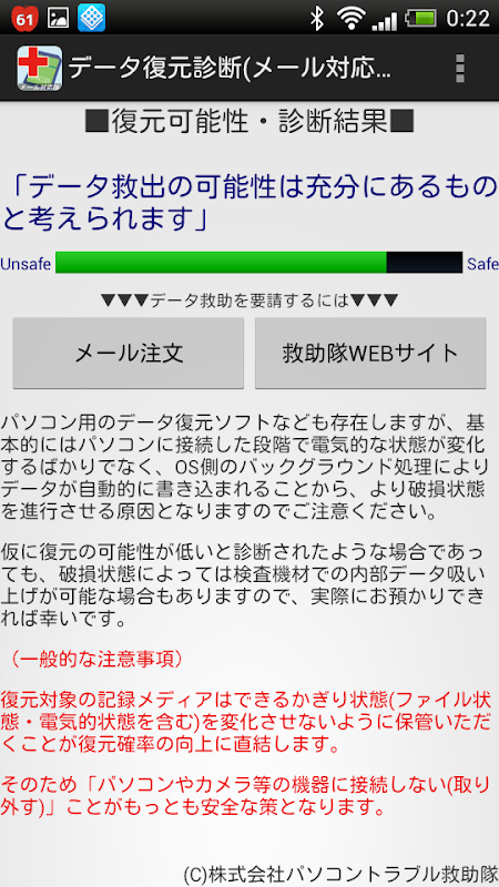 すでに公開済みの「データ復元診断」アプリと同じ判定内容ですが、診断結果のメール送信機能などを追加しており、簡単に有料の復旧サービスをご注文いただくことができます。