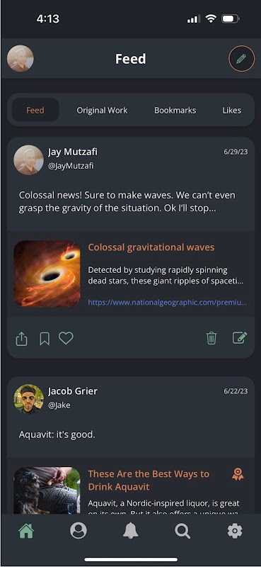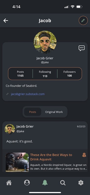 Wanneer u uw eigen schrijven of andere inhoud op Seabird deelt, heeft u de mogelijkheid om dit als uw originele werk te markeren. Deze berichten zijn oranje gemarkeerd en verzameld op een prioriteitstabblad waar lezers direct in de nieuwste publicaties kunnen duiken van schrijvers die ze volgen. Profielpagina's bevatten ook een tabblad waarop origineel werk wordt verzameld en bieden een gemakkelijk toegankelijke portfolio voor individuele schrijvers (of, zoals we het graag noemen, hun "SeaVee"). Wanneer u iets deelt onder uw eigen naamregel, vink dan de optie "origineel werk" aan bij het plaatsen.