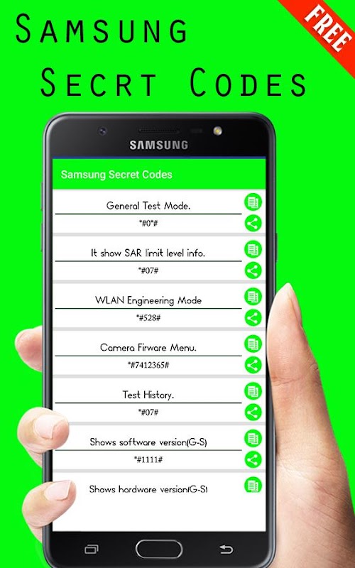 Secret Codes of Samsung application include the secret codes general android and Samsung codes You have to click on copy button, code automatically copied and paste it on dialer by longpress. Secret Codes of Samsung for mobile contains common android secret codes include Network, GPS, Hard reset any device, Password recover, Password forgotten, Software & WH info, auto answer selection, RF Band Selection, Camera Pixels, WLAN Mac Address, Display CSS Code, Bluetooth, WLAN test, Firmware version information, factory tests, PDA, display the IMEI number, Super Mode, Service Menu, Check Update, Reset Device, Unlock the device, Recover Forgotten pattern, Engineering mode, GPS test mode, Machine information, Software Information, Hardware Information, Test Photograph RGB and much more.