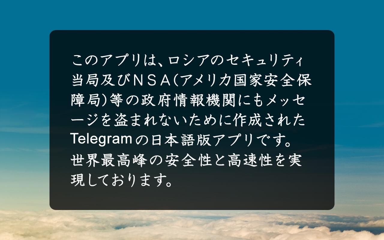 このアプリは、世界で最もセキュリティーレベルの高いと言われるメッセンジャーアプリ(Telegram)の初の日本語版クライアントアプリ、セキュリティーメッセンジャー(Secure MSG)です。