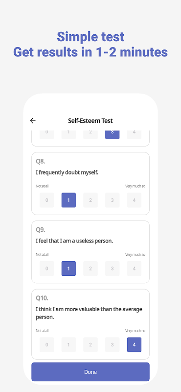 Via deze eenvoudige psychologische test kunt u uw gevoel van eigenwaarde controleren en hulp krijgen bij persoonlijke groei en het verbeteren van relaties. Met de praktische tips en adviezen van de app ontwikkel je een gezonder gevoel van eigenwaarde.