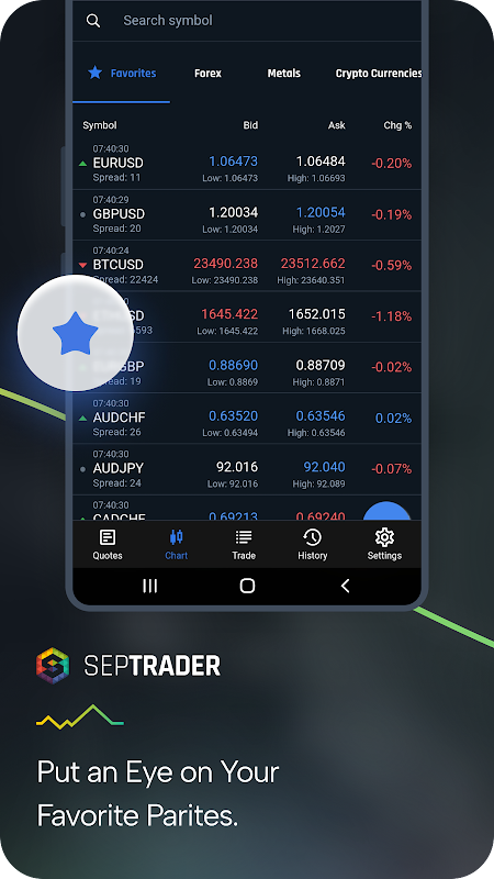 Maak verbinding met honderden financiële markten met behulp van het SepTrader-platform voor Android-apparaten.