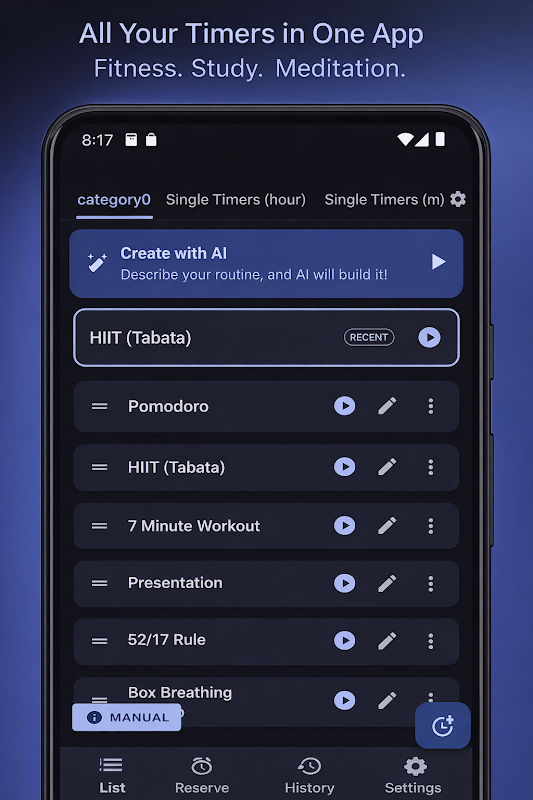Maak timersequenties voor studiesessies, geconcentreerd werken, workouts, koken en dagelijkse gewoontes. Begin snel met kant-en-klare presets of bouw je eigen flow