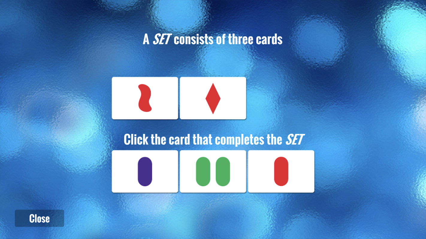 SET Mania bevat een interactieve tutorial die het gemakkelijk maakt om te leren. Het doel is om alle SET's zo snel mogelijk te vinden. Een SET is 3 kaarten waarin elk afzonderlijk kenmerk (kleur, vorm, nummer en arcering) ofwel allemaal hetzelfde is... of allemaal VERSCHILLEND op elke kaart.