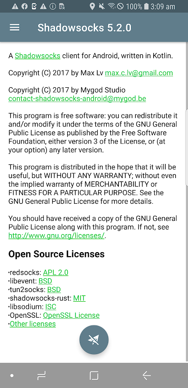 Andere open source-licenties is hier te vinden: https://github.com/shadowsocks/shadowsocks-android/blob/master/README.md#open-source-licenses
