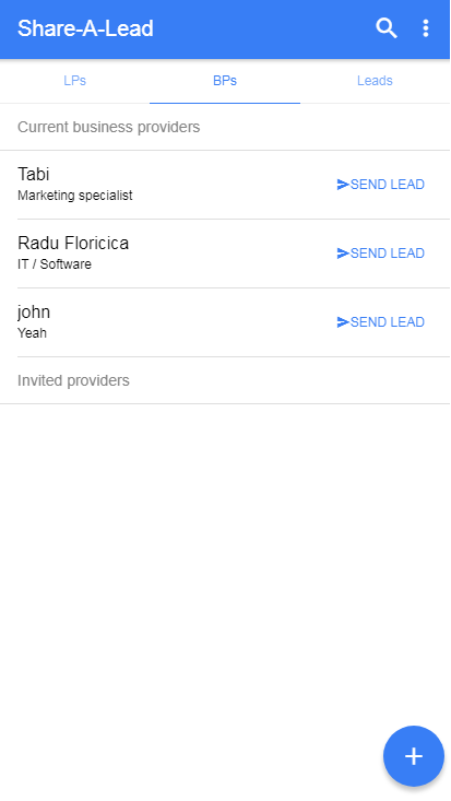 You can invite potential lead providers here and then you will see a list of your current providers here. Each user can be both a lead provider and a business provider, by setting his info in his profile details.
