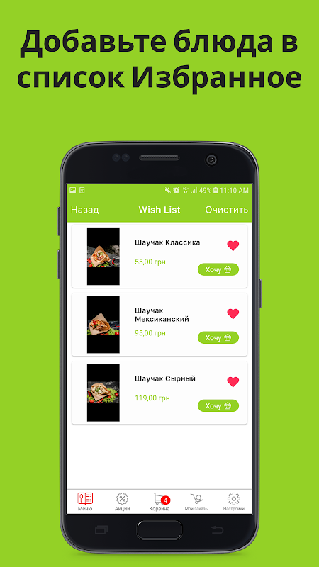 Используя мобильное приложение Shauchack, Вы с легкостью можете заказать Итальянский Чак, Сырный Чак и многое другое. Также в нашем меню Вы найдете напитки и не только. Доступные в приложении сортировка по цене, подробные описания и качественные фотографии блюд помогут Вам выбрать именно то, что Вы хотите. Наш ассортимент, включающий специальное вегетарианское меню, способен удовлетворить самого требовательного покупателя.