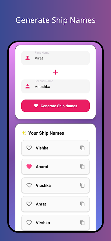 Met de Scheepsnaamgenerator kun je eenvoudig twee namen combineren om een leuke, romantische of leuke bijnaam te creëren voor koppels, vrienden of favoriete personages. Of je nu een unieke liefdesnaam, een leuke vriendencombinatie of gewoon iets creatiefs wilt, deze app maakt het eenvoudig en magisch.