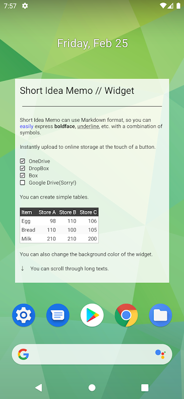 Op basis van CommonMark past het zijn eigen uitgebreide regels toe voor kleuruitdrukkingen, onderstrepingen en andere uitdrukkingen. U kunt ook checklists en tabellen maken, die handig zijn voor het noteren van uw boodschappen, takenlijsten, enz. De achtergrond en tekstkleur van de widget kunnen ook worden gewijzigd via de instellingen.