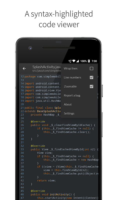 • Displays code in a clean-syntax-highlighted form with zoom & line-wrap.