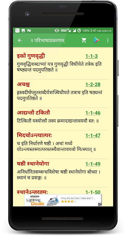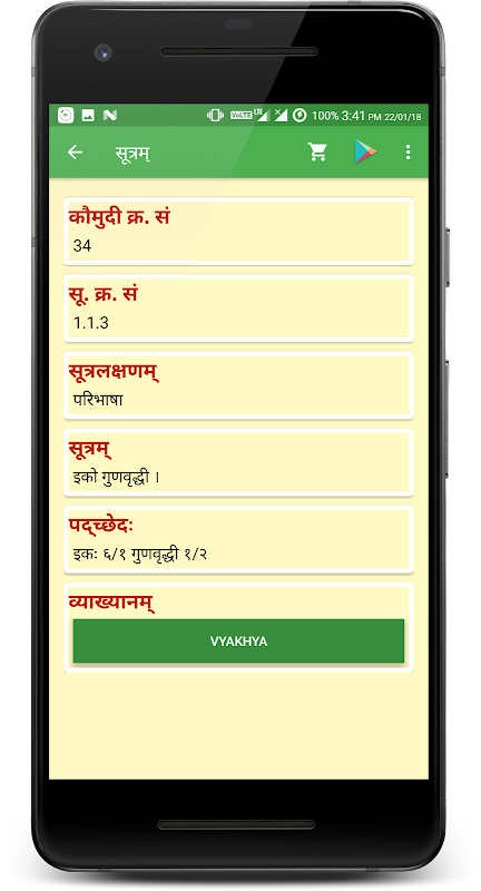 सिद्धान्तकौमुदीति ऐप मध्ये सिद्धान्तकौमुद्यनुसारं सर्वाणि सूत्राणि पदच्छेद - समास - अर्थ- वृत्ति - लघुसिद्धान्तकौमुदी - उदाहरण - समास - प्रथमावृत्ति - काशिका-काशिकावृत्तिन्यास-बालमनोरमा-तत्त्वबोधिनीत्यादिटीकाभिः ONLINE सुसज्जितानि वर्तन्ते.