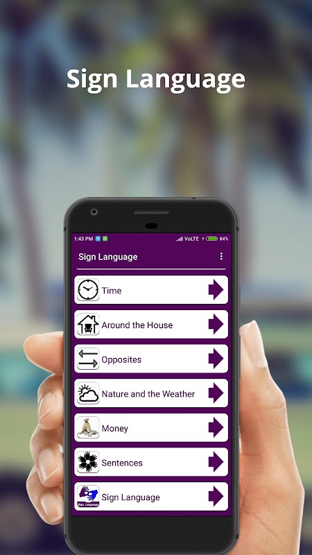 De gebarentaal-app is onderverdeeld in verschillende secties die beginnen met basisprincipes, zoals alfabetten en cijfers. De lijst met secties gaat verder met begroetingen, vraagwoorden, dagen en tijd van de dag, kleding, familieleden en mensen, emoties, kleuren, maaltijden, gezondheid, tegenstellingen, natuur en het weer, zinsopbouw en meer.