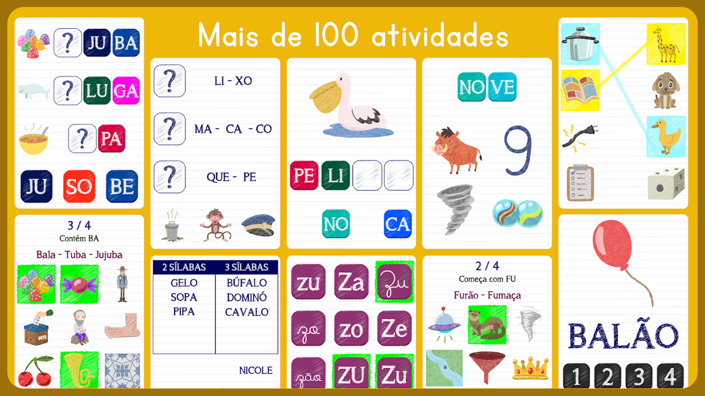 De belangrijkste activiteiten van het spel, onderverdeeld in enkelvoudige en complexe lettergrepen of alle lettergrepen samen, zijn: