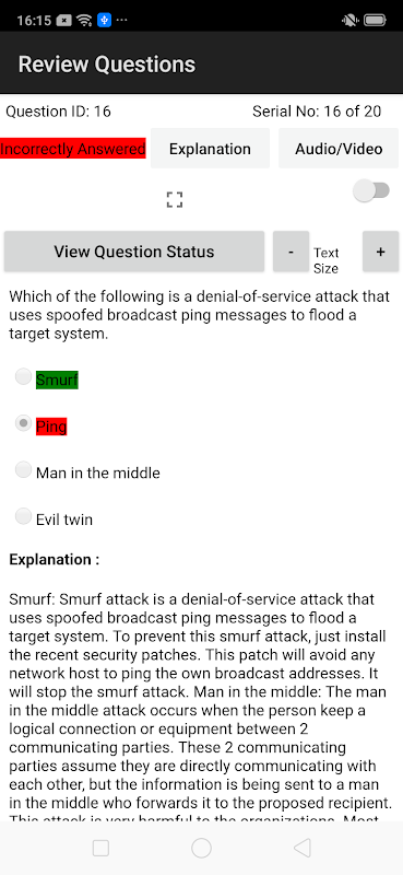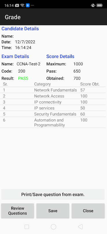 c. Review-modus – Aan het einde van elke examenmodus (leren/examen) kunt u de resultaten voor dat examen opslaan om ze later te bekijken. In de beoordelingsmodus kunt u opgeslagen examens bekijken met door de kandidaat geselecteerde antwoorden, samen met het juiste antwoord en gedetailleerde uitleg voor elke vraag (indien verstrekt door de auteur).