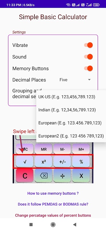 3. Four additional Percentage buttons for GST/TAX/VAT etc. calculation, you can edit the percentage value.