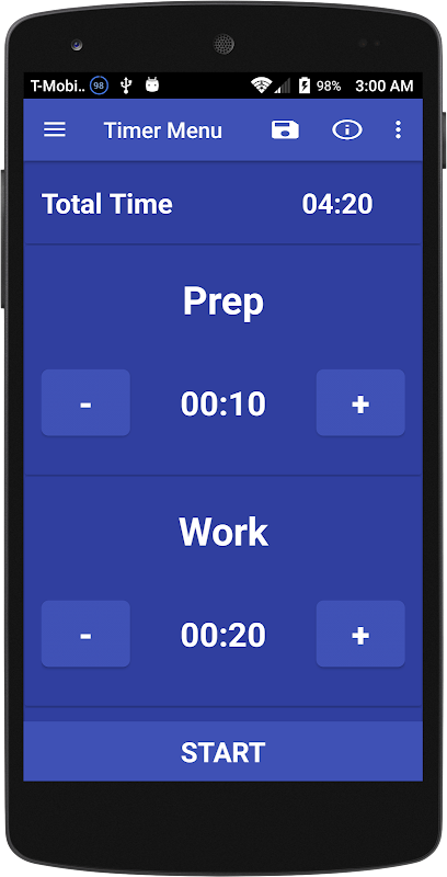 - Customize your workout by adjusting the prep, work, rest, round and cooldown settings