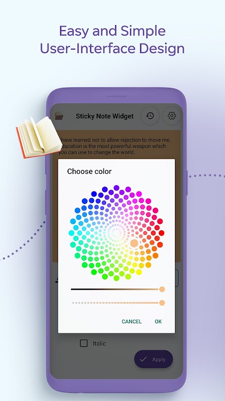 De Simple Sticky Note Widget-app gaat verder dan alleen tekstaanpassing doordat u de achtergrondkleur van uw notities kunt personaliseren. Of u nu de voorkeur geeft aan een levendige tint of een meer ingetogen toon, u kunt de achtergrond eenvoudig aanpassen om een visueel aantrekkelijke en samenhangende look te creëren.