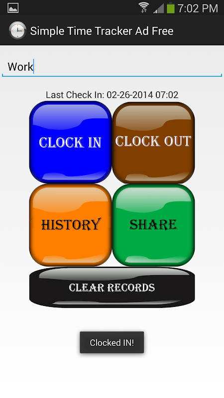This app is add supported. Please see our ad free edition (Simple Time Tracker Ad Free) to remove ads. THE AD FREE VERSION ALSO CONTAINS A WIDGET FOR FASTER CLOCKING IN AND OUT.