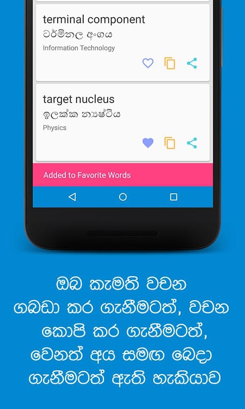 In deze mobiele app Sinhala - Engelse wetenschappelijke woordenlijst, meer dan 90.000 woorden die alle wetenschappelijke disciplines omvatten, zoals landbouw, plantkunde, onderwijs, IT, wiskunde, natuurkunde, statistiek, scheikunde, aardrijkskunde, bibliotheekwetenschap, geowetenschappen, informatica, moleculaire biologie , Verpleegkunde en Zoölogie.