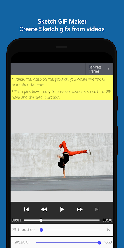 * Maak geanimeerde gifs - Selecteer de video uit de galerij, verplaats de hendel naar het begin van de GIF en druk op de knop "Frames genereren".