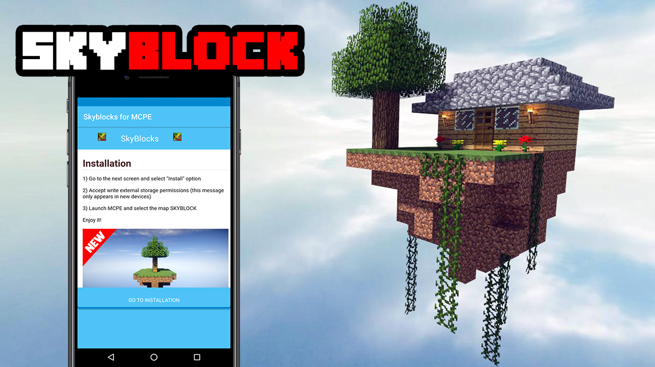 Skyblock PE gives you the best version of Skyblock for minecraft pocket edition in your smartphone. Installation is very easy, just follow the steps in the app. Thirds apps is not required.