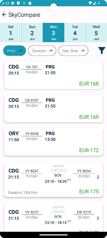 Met slechts één tik ontketent u een schat aan vluchtopties die zijn afgestemd op uw voorkeuren. Van Economy tot First Class, wij staan voor u klaar. Blader door een uitgebreide selectie vluchten van verschillende luchtvaartmaatschappijen, allemaal handig weergegeven ter vergelijking. Met realtime updates blijft u altijd op de hoogte van de nieuwste beschikbaarheid en tarieven.
