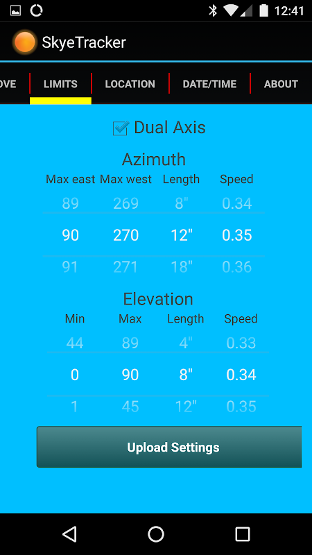 App gebruikt om de SkyeTracker te configureren en te besturen, Het schakelschema samen met de broncode staat op github op ClassicDIY / SkyeTracker .
