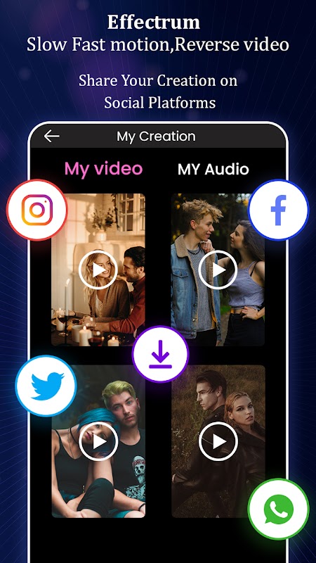 Met alle Video Editor-effecten, Slow Fast Motion, Reverse Video Editor-app kun je video's uit je galerij bewerken en publiceren in de opslag van Android-mobiele telefoons. Krijg deze machtige maar gebruiksvriendelijke verhalenmaker om te delen op sociale mediaplatforms zoals Facebook, Instagram, YouTube, Twitter, Telegram, Vimeo en nog veel meer.