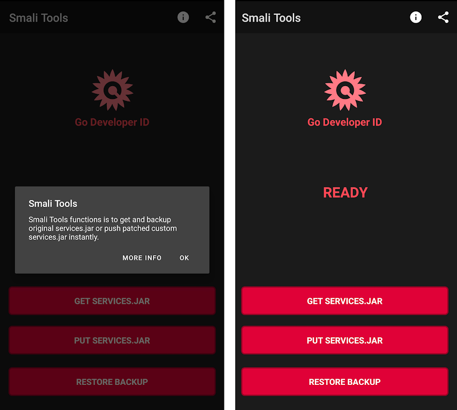 1. Fetch services.jar automatically from the system folder. Retrieved file will be stored in the "Android" folder on internal storage.