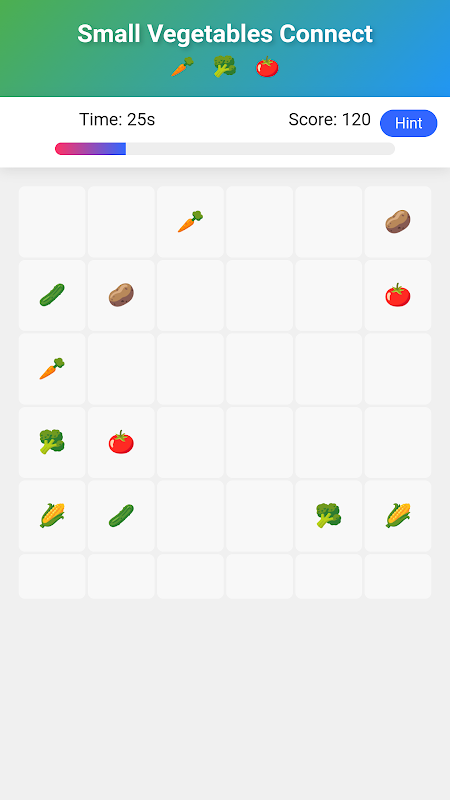Dit is een informeel spel waarbij je kleine groenten met elkaar verbindt. Spelers moeten op twee identieke groenten achter elkaar klikken om ze te elimineren. Als je de groenten die je wilt verwijderen niet kunt vinden, kun je op de hintknop in de rechterbovenhoek klikken! Als alle groenten binnen de tijdslimiet zijn geëlimineerd, win je, anders verlies je! Kom en nodig je vrienden uit om samen uit te dagen