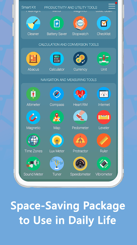 Smart Kit 360 is an all-in-one app and is half the size of a common "standalone tool" application like compass, translator or a ringtone maker app. This way you'll save a lot of disk space, time and frustration searching for all the daily essentials you need!