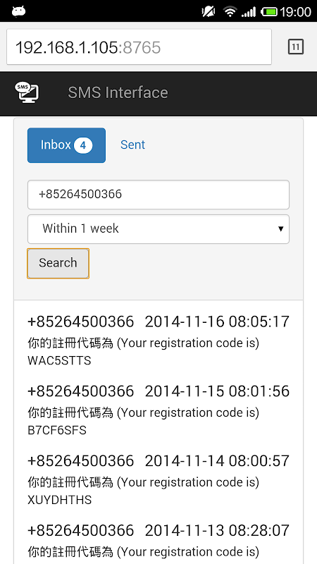 Retrieve SMS (within 24 hours): http://ip-address:8765/listSMS?folder=inbox&address=&period=86400000