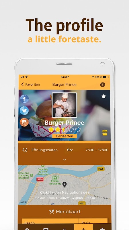 Wat, waar en wanneer? Als de gebruiker het profiel van een foodtruck of een afhaalmaaltijd bezoekt, krijgt hij een veelheid aan informatie: