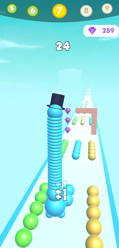 What does a snowman 3d want in winter? He dreams to become the tallest man made of snow, and also receive hats as a gift. Run on the road, collect colored balls in order to increase the hight of the long neck snowman head and to win christmas gifts.